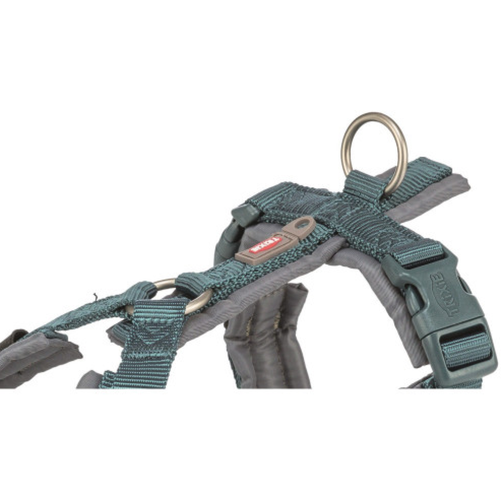 Шлея Trixie Premium трекінгова ідеально підходить для щоденних прогулянок з улюбленцем, гарантуючи вам надійний контроль, а песику – безпеку. Вона виготовлена з міцної ремінної стрічки, має м'яку оббивку по всьому колу. Ремінці на шиї та животі регулюються, що дає можливість підігнати шлею під індивідуальні розміри собаки. Є додаткове кільце для кріплення повідця в області грудей і петля для кріплення жетона або мигалки.