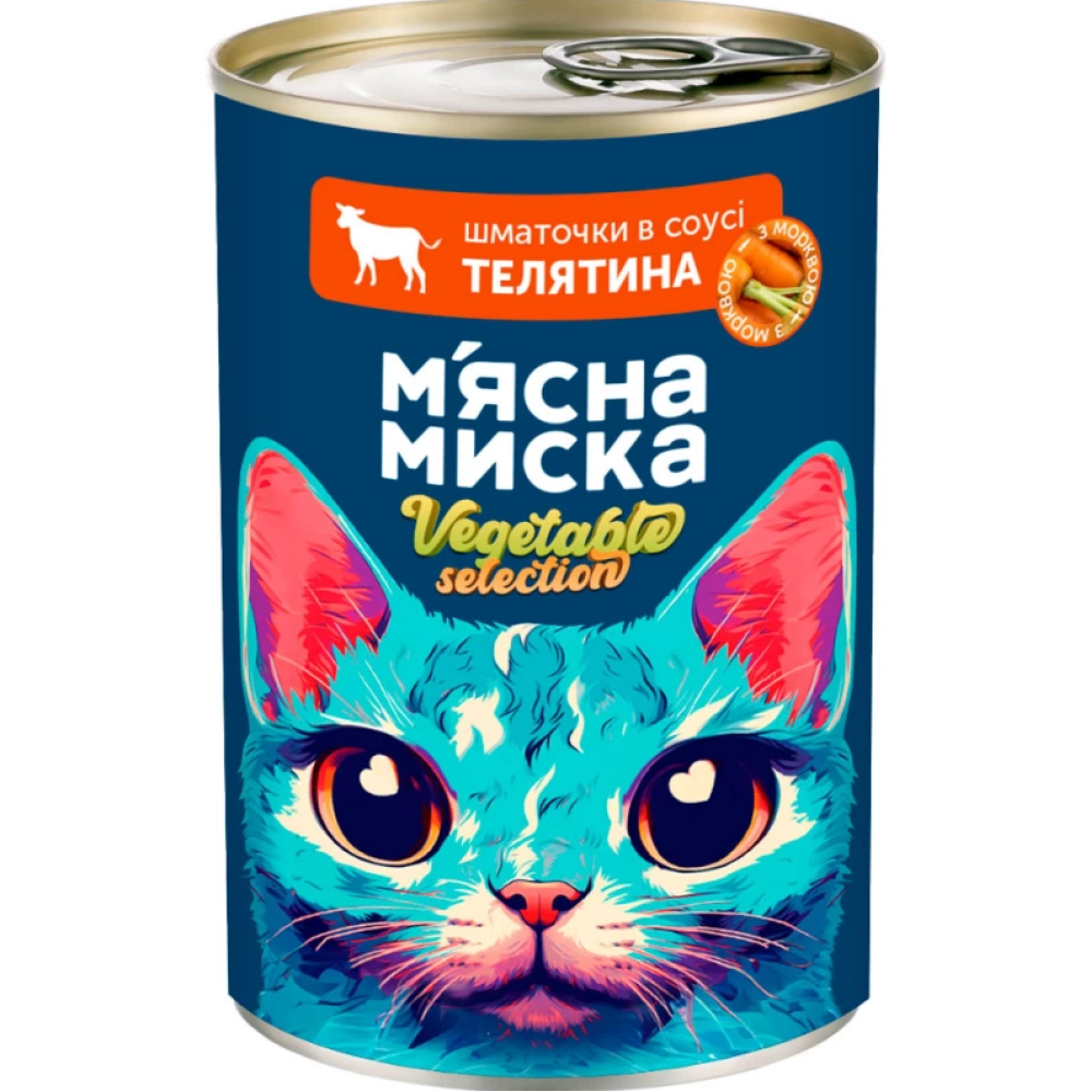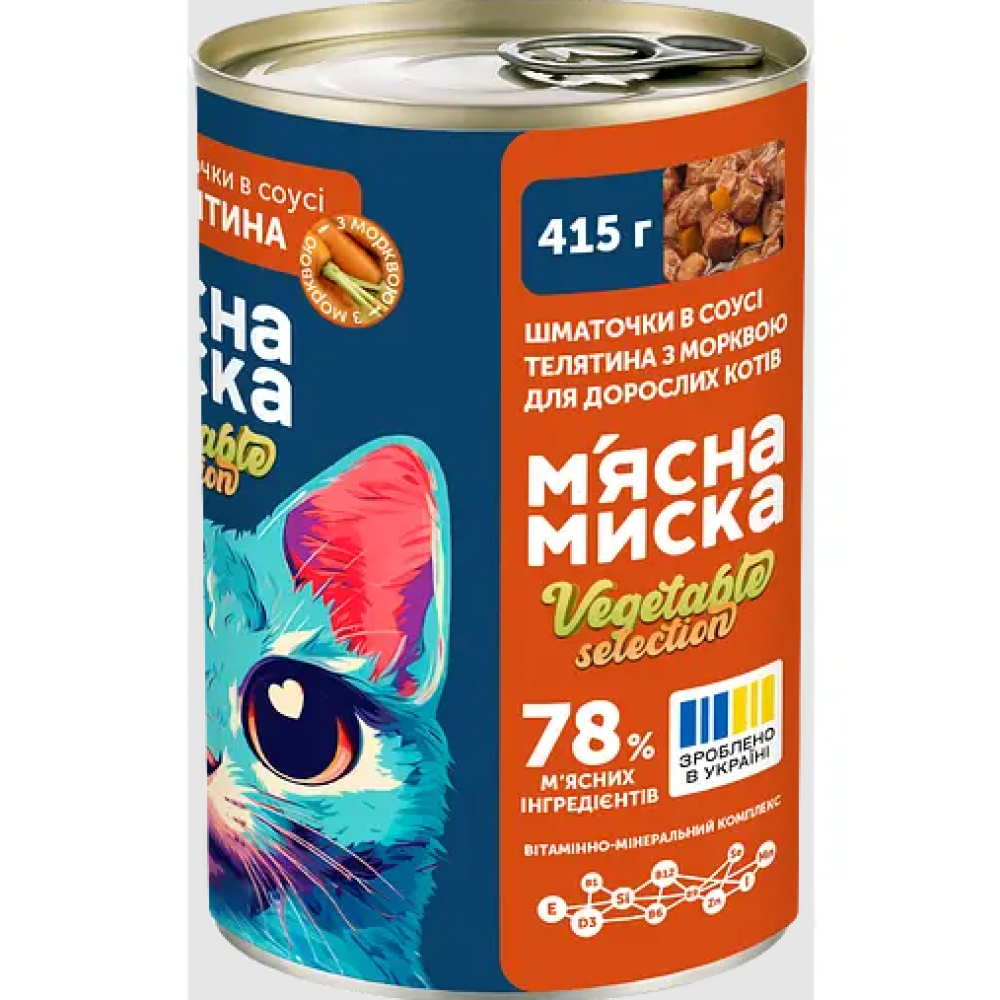 Повнораціонний корм для дорослих котів М'ясна Миска шматочки в соусі з морквою - це новий стандарт консерв економкласу, з високим вмістом справжнього м'яса, не менше 76% м'яса у кожному шматочку.