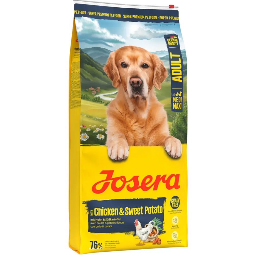 Josera Medi/Maxi Chicken & Sweet Potato - добре засвоюваний корм без картоплі для активних собак середніх та великих порід. Беззернова рецептура з бататом, ніжною курятиною та дієтичною клітковиною вирізняється особливою легкістю засвоєння. Вітамін E та L-карнітин забезпечують активних любителів прогулянок додатковою енергією.