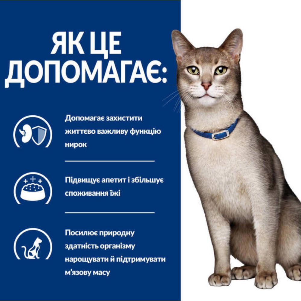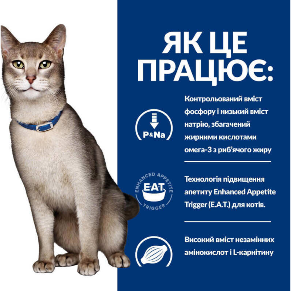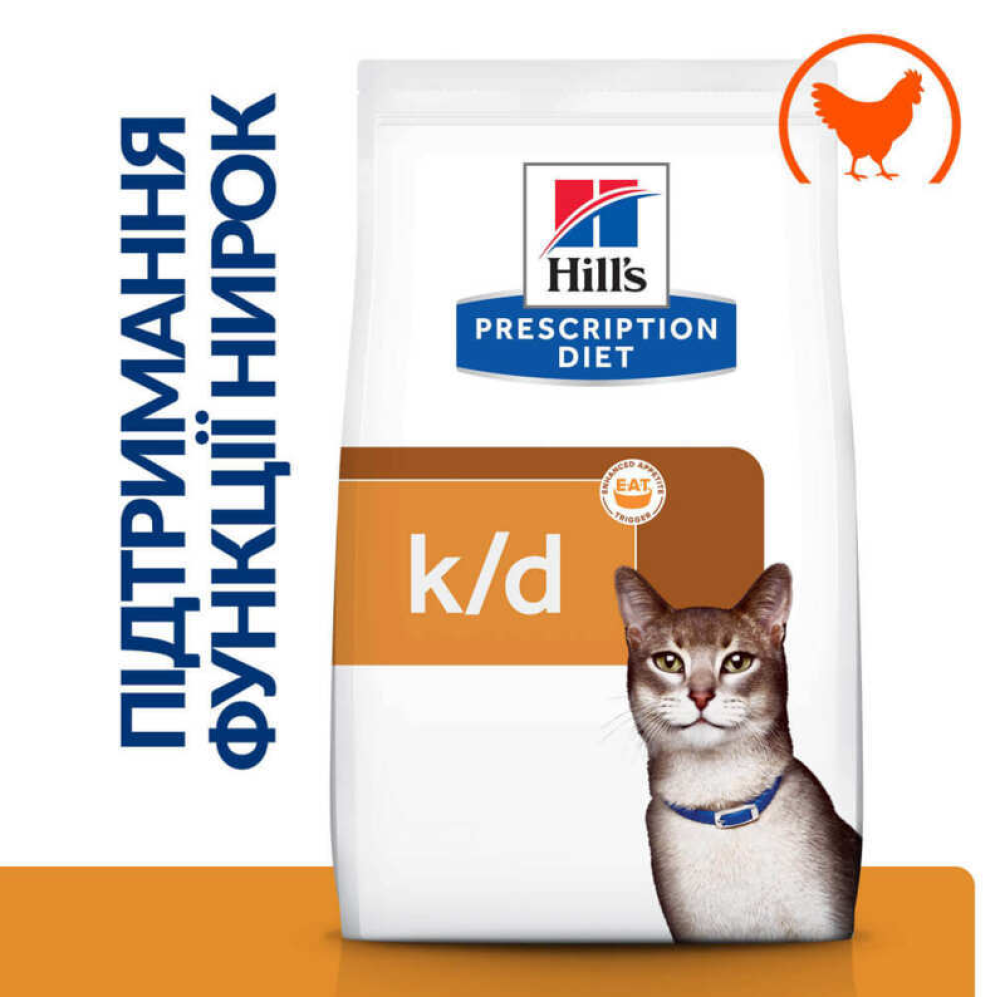 Сухий корм для кішок Hill's Prescription Dietз курка – повнораційний дієтичний корм, що підтримує належне функціонування нирок при гострій та хронічній хворобі нирок у дорослих кішок. Корм відрізняється низьким вмістом фосфору та обмеженим вмістом високоякісного білка, що допомагає у лікуванні хвороби нирок та уповільнює прогресування захворювання. Клінічно доведено, що сухий корм для кішок Hill's Prescription Diet з запатентованою технологією підвищення апетиту Enhanced Appetite Trigger (E.A.T.) посилює апетит у кішок з хворобою нирок, що потребують підвищеного споживання калорій. -карнітин, цей корм має збільшену калорійність, яка щодня посилює природну здатність організму кішок нарощувати та підтримувати м'язову масу.