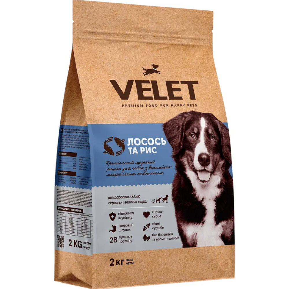 Сухий преміум корм Velet Лосось та Рис для дорослих собак середніх і великих порід.