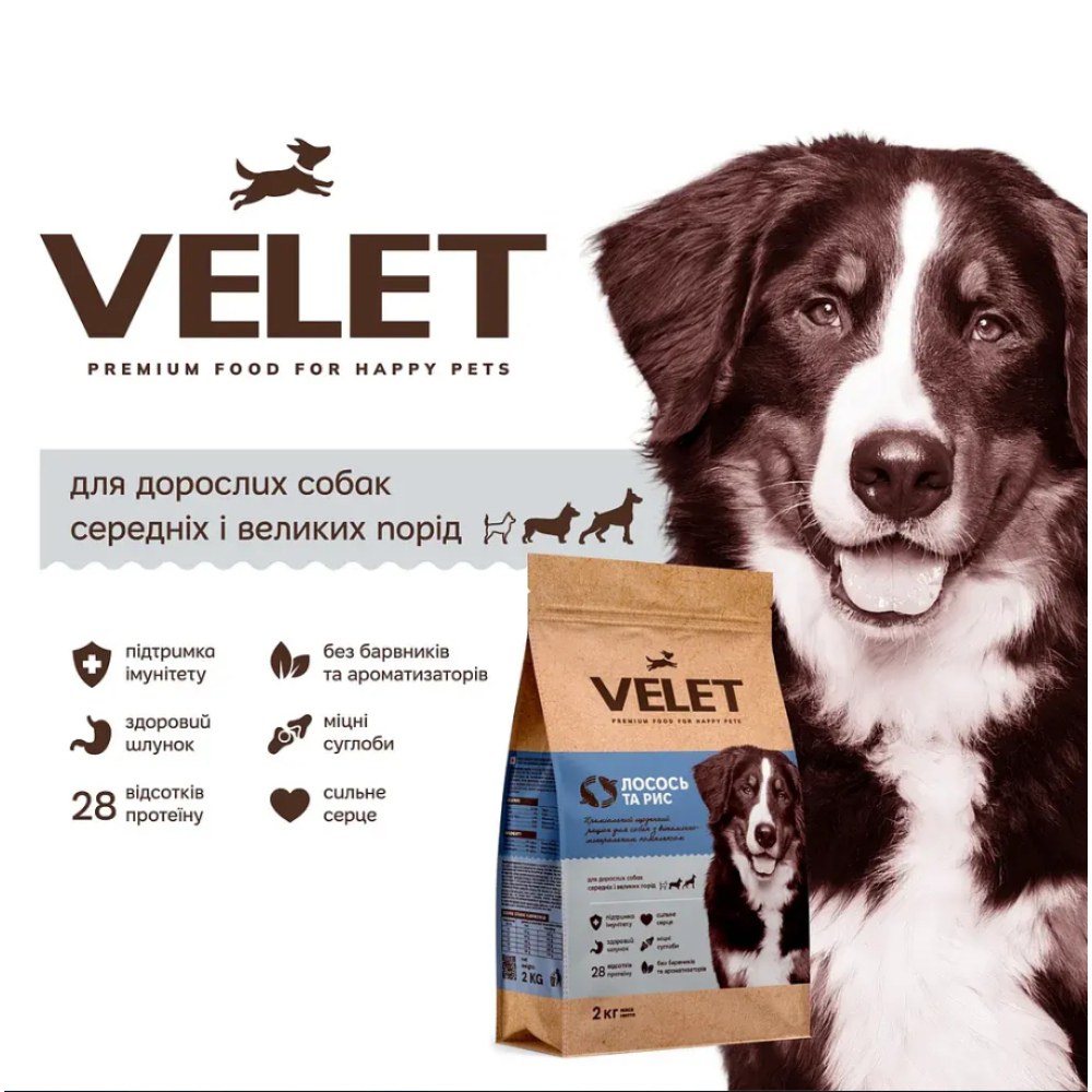 Регулярно харчуючись таким раціоном, пес отримує всі необхідні йому для здоров'я та активного способу життя поживні речовини, вітаміни та мінерали. Якщо ви хочете якнайкраще подбати про свого хвостатого друга, рекомендуємо купити йому сухий корм від ТМ "Velet" з лососем і рисом.