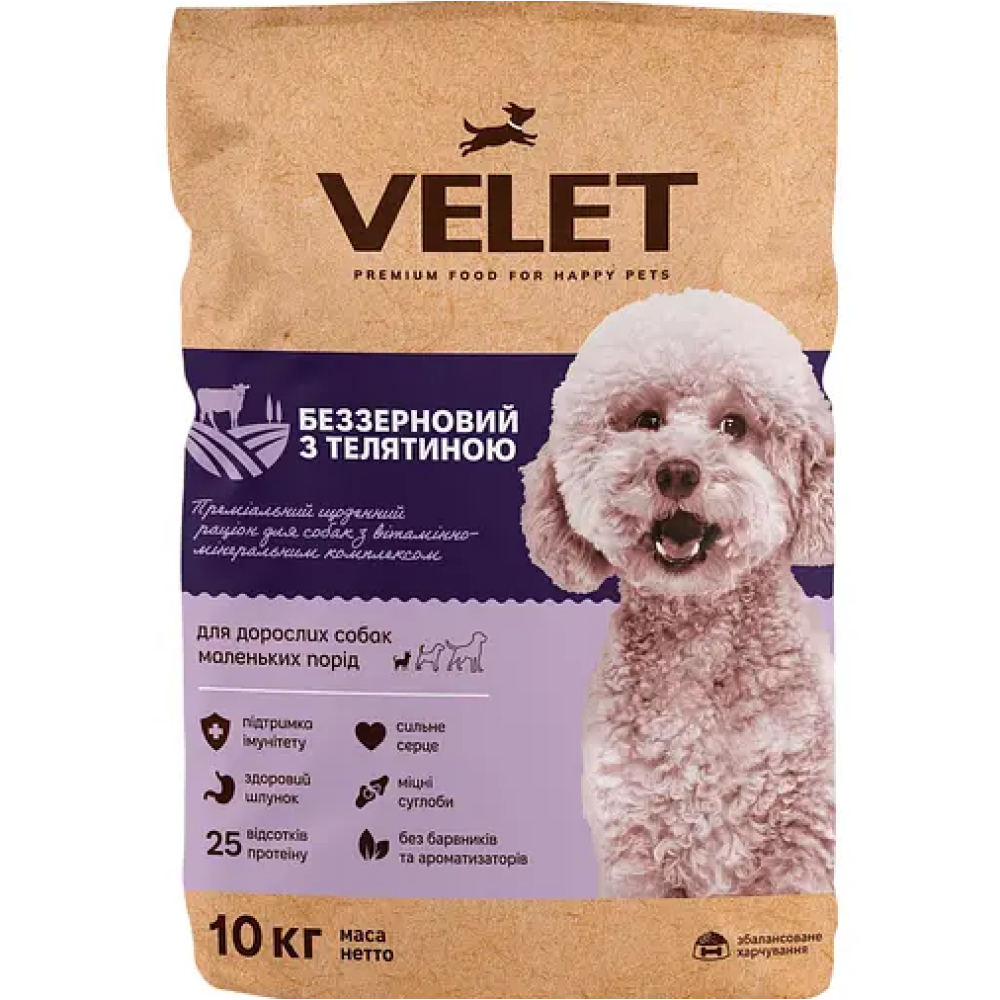 Беззерновой корм Velet с телятиной для взрослых собак маленьких пород.