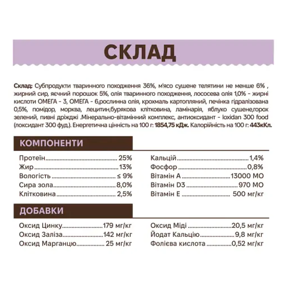 Субпродукты животного происхождения 36%, мясо сушеное телятины не менее 6%, жирный сыр, яичный порошок 5%, масло животного происхождения, лососевое масло 1,0% - жирные кислоты Омега-3, Омега-6, масло, крахмал, печень гидролизованная 0,5%, помидор, морковь, лецитин, свекольная клетчатка, ламинария, сушеное яблоко, горох зеленый, пивные дрожжи. Минерально-витаминный комплекс, антиоксидант - loxidan 300 food (локсидант 300).