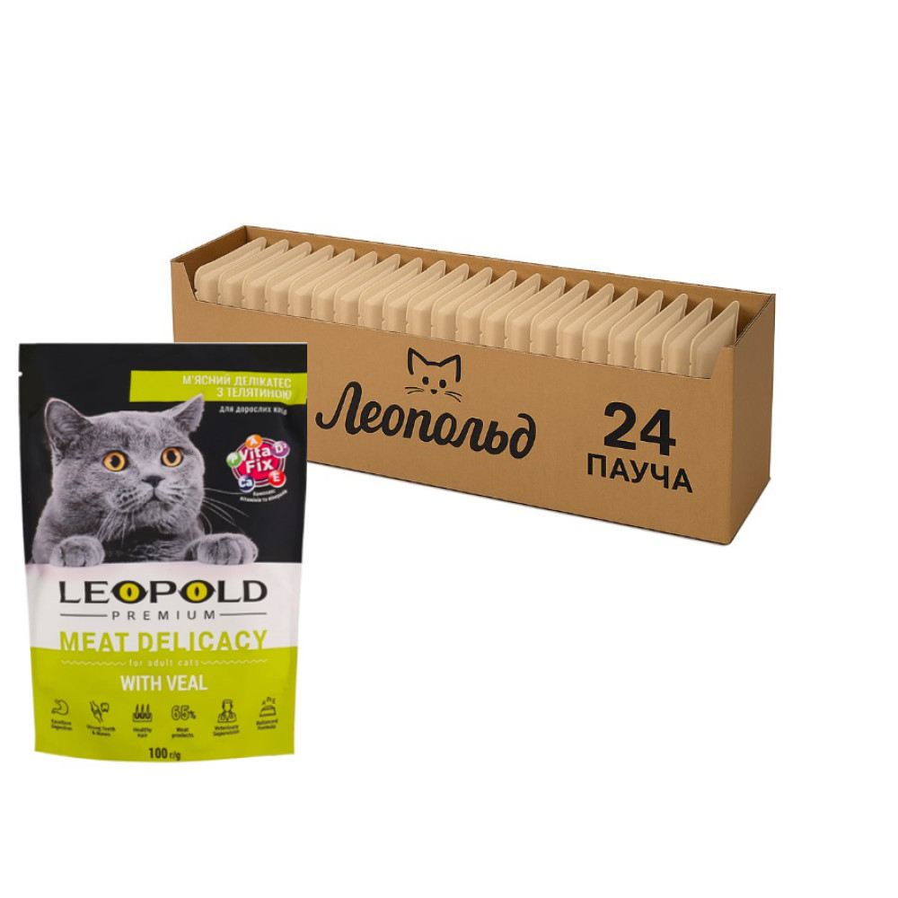 Консервы Леопольд - это готовый обед для кошек всех пород с телятиной. Питание для кошек должно быть не только вкусным ароматным, но и полезным. Вкусный и ароматный влажный корм служит как полноценное питание, а в случае необходимости может использоваться как добавка для разнообразия рациона и усиление ароматной привлекательности. Питание понравится и привередливому коту и питомцу, который плохо питается. Влажный корм не содержит красителей, ароматизаторов и сои, изготовлен только из натурального мяса и мясо-продуктов.